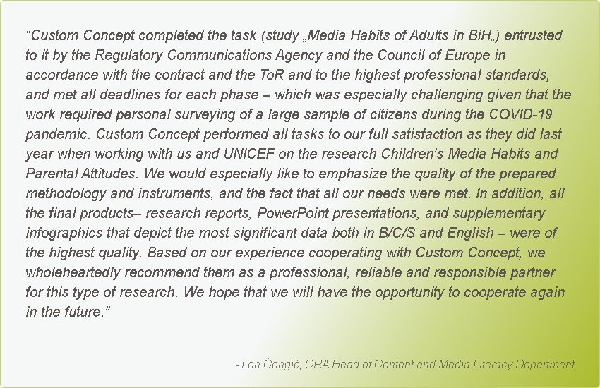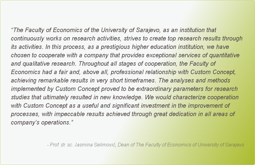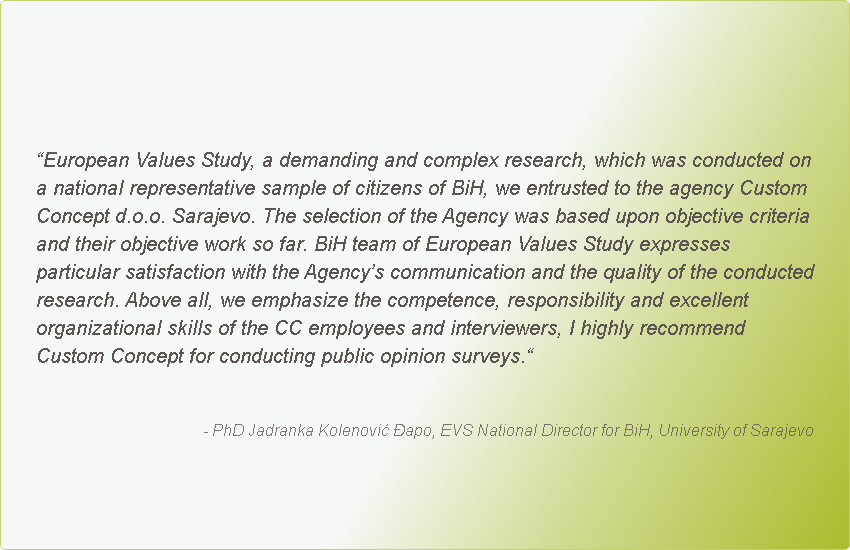 Custom Concept operates as a small female company, but with a large number of carefully selected external associates. Custom Concept has a highly developed network of 120 interviewers, which covers entire Bosnia and Herzegovina – with eight regional coordinators, 25 CATI interviewers, controllers and typists, as well as a number of other professionals in the field of research/other various fields, whose work contributes to each research being implemented in a quality and timely manner.