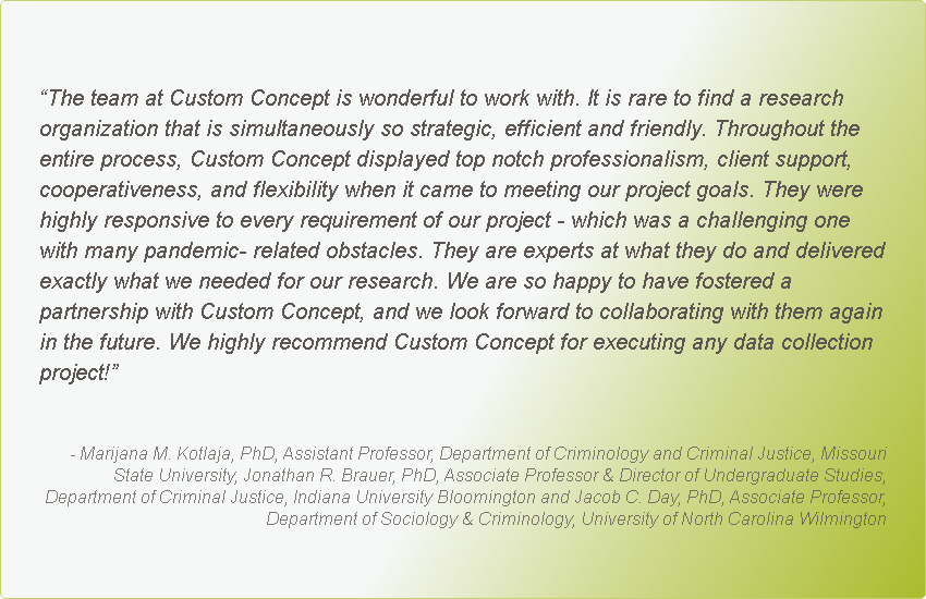 Quality control is of greatest importance to Custom Concept. Control of work of everyone involved in research process is carried out throughout the entire research, from the data collection phase to the final validation, through numerous methods of field, telephone, and logical control. This ensures the reliability of data/information obtained and enables their generalization to the entire target group of the research.