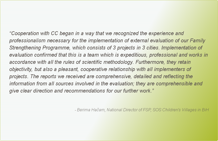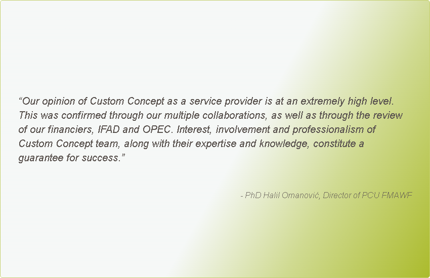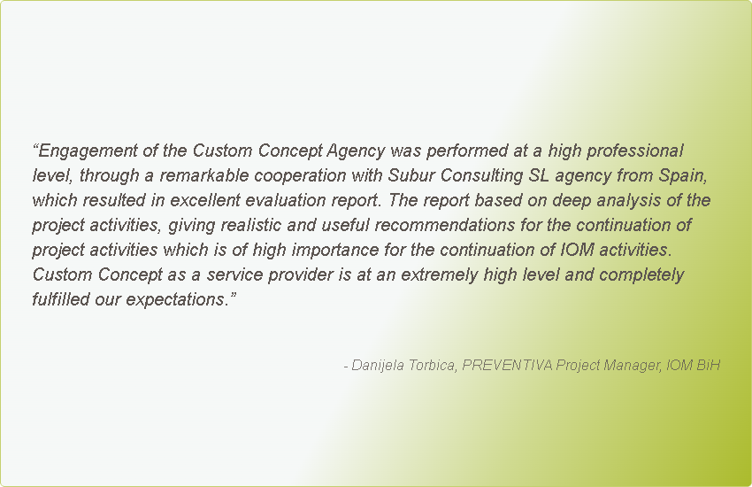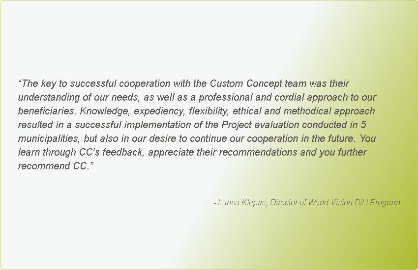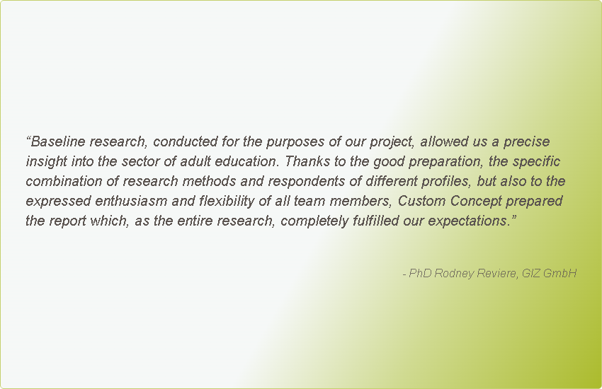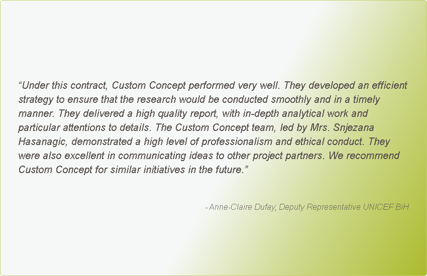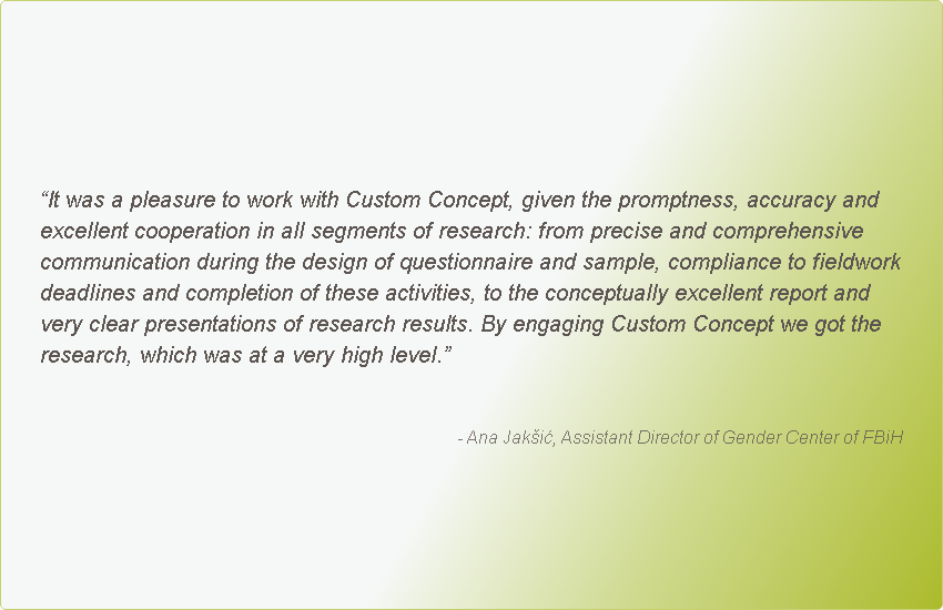 Since its establishment in April 2010, Custom Concept has collaborated with an array of national and international Clients from the public, NGO and private sector. Satisfaction with the methods and the results of work performed by Custom Concept is best explained by the fact that, after the initial experience, Clients chose Custom Concept again to conduct their research.